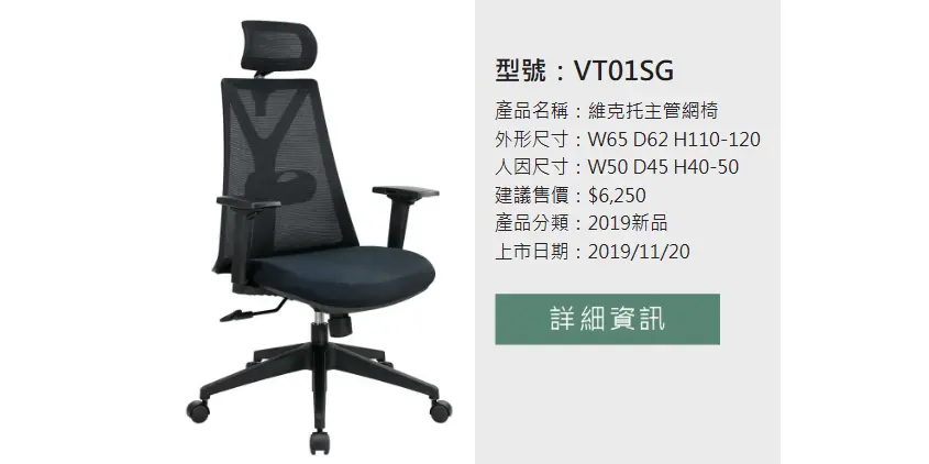 年底是辦公家具更新的旺季,向您推薦本公司2019年12月新產品。 產品型號:VT01SG 產品名稱:維克托主管網椅 外形尺...