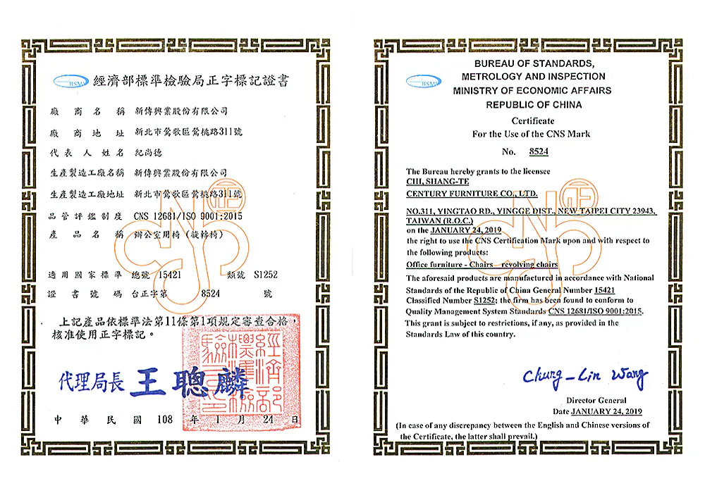 經過5年的努力,新傳辦公椅以下幾點有明顯進步: 1.服務人員增加一倍,持續的教育訓練,業界素質最高。 2.合法的工廠登記證,有CNS正字標記,MIT台灣製造標章...