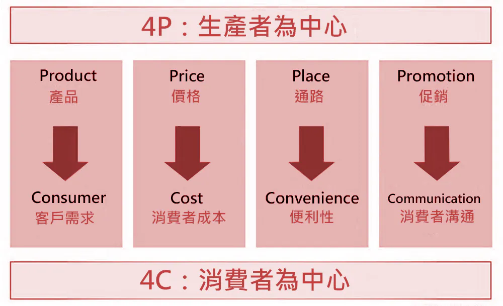 傳統行銷學以4P理論為基礎。Product 產品、Price 價格、Place 通路、Promotion 促銷。 廠商製造自認為好的產品、以成本推算出售價、放...